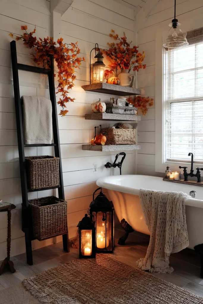 This farmhouse-inspired bathroom embraces rustic charm with shiplap walls, woven baskets, and floating wooden shelves. Pops of orange from autumn leaves and pumpkins bring warmth, while lanterns and candles create a gentle seasonal glow. The clawfoot tub adds vintage character, making the whole setup feel like the coziest fall evening ever.