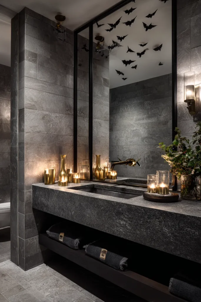 Here, a sleek gray stone bathroom becomes Halloween-ready with golden candleholders and a dramatic ceiling display of black bats. The clean lines and textured stone surfaces keep the look polished, while the candles bring warmth and movement to the cool-toned palette. The bats are playful without being over the top, adding just the right amount of whimsy.