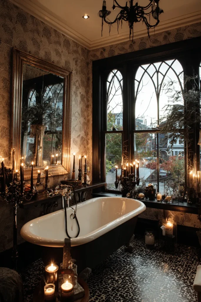 This bathroom takes Halloween styling to a dramatic level with dark wallpaper, tall gothic windows, and a freestanding tub surrounded by clusters of black and gold candelabras. The flicker of candlelight against the patterned walls gives the space a moody, romantic atmosphere that feels straight out of a haunted mansion. Every detail, from the chandelier to the ornate mirror, adds to its gothic allure.