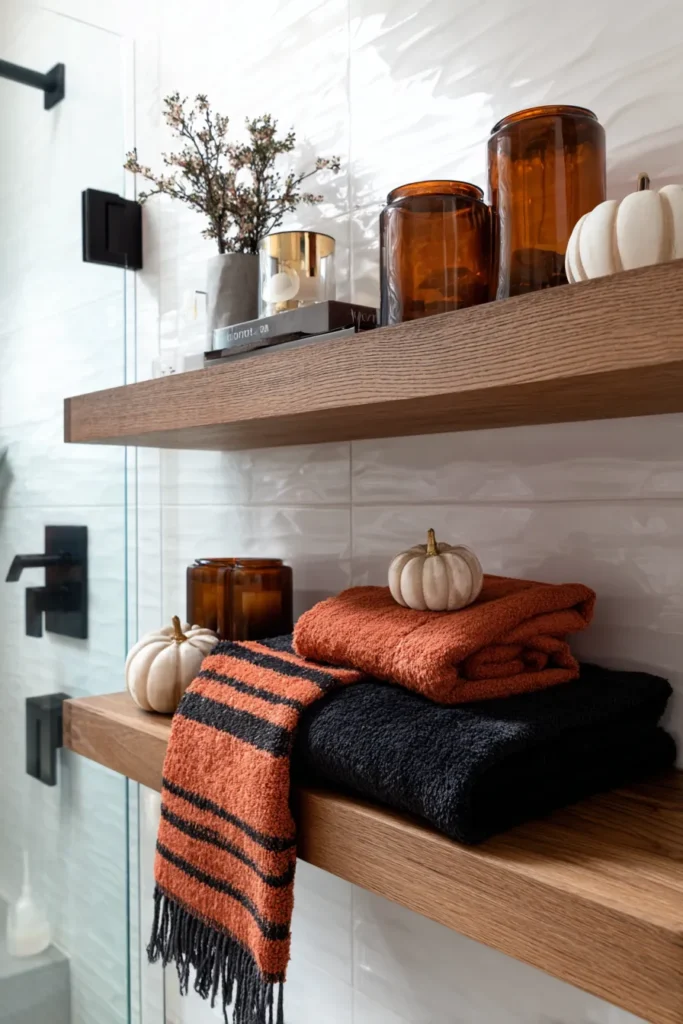 This bathroom keeps things simple yet festive with wooden shelves styled with amber glass jars, mini white pumpkins, and towels in black and burnt orange tones. The striped towel instantly brings that Halloween feel without overwhelming the space, while the mix of textures between the wood, glass, and soft fabrics makes everything feel warm and layered. The look is effortless but still gives a nod to the season.