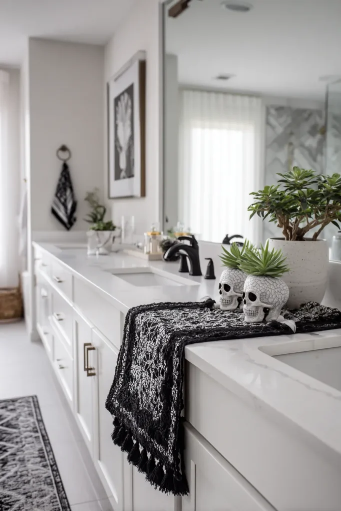 A crisp white bathroom becomes instantly Halloween-ready with just a few bold details. Black and white décor pieces, from the lace runner to the framed artwork, create contrast against the clean lines of the vanity. The highlight of the space has to be the skull planters, which bring both a spooky and playful touch while still feeling chic.