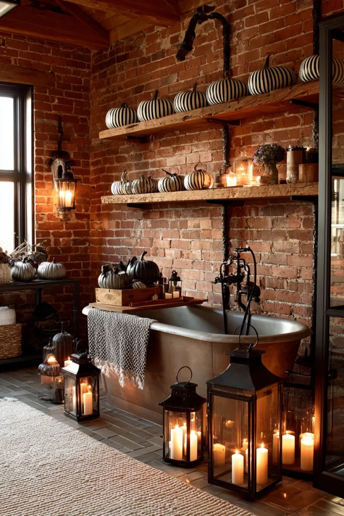 Exposed brick walls and a metal tub create an industrial backdrop, while shelves lined with striped pumpkins give the space a festive personality. Lanterns filled with candles glow against the brick, making the bathroom feel warm and atmospheric. The balance of raw textures with playful Halloween details makes this look feel both bold and cozy.