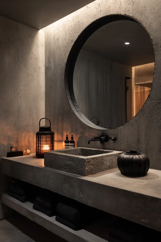 This bathroom embraces a sleek, minimal vibe with concrete walls and a bold round mirror. A single black pumpkin and a softly glowing lantern bring just enough Halloween spirit without disrupting the clean aesthetic. The design feels dramatic yet calm, leaning on texture and lighting instead of clutter.