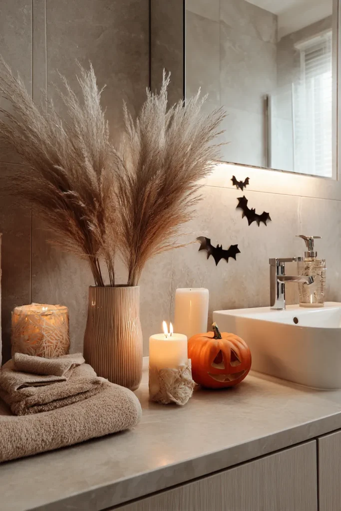 Warm beige tones set the stage in this bathroom, with soft candles, pampas grass, and a cheerful pumpkin creating seasonal coziness. Small black bat cutouts flutter up the wall for a playful touch, making the space feel festive without losing its calming vibe. The mix of natural textures and whimsical details makes this bathroom both stylish and fun.