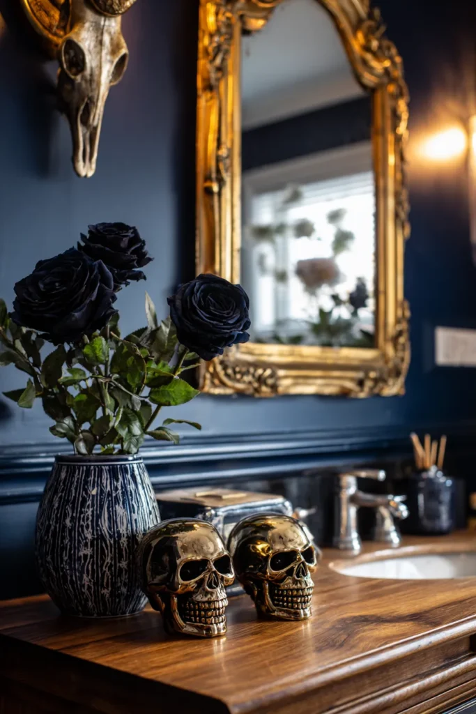 This bathroom brings drama and elegance with deep navy walls, a grand gold-framed mirror, and bold accents like black roses and metallic skulls. The mix of dark tones and shimmering gold creates a moody yet glamorous atmosphere that feels perfectly suited for Halloween. Every detail, from the polished wood vanity to the decorative skull, adds to the richness of the look.