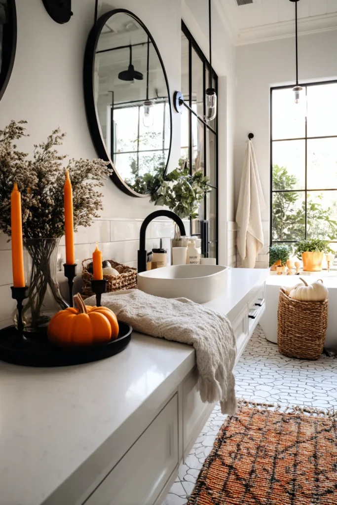 Here, a fresh white bathroom gets a seasonal makeover with pops of orange from pumpkins and candles. Natural textures like woven baskets, soft throws, and greenery balance out the sleek design, making the space feel both cozy and sophisticated. The black-framed mirrors and fixtures tie everything together, adding a crisp, modern edge.