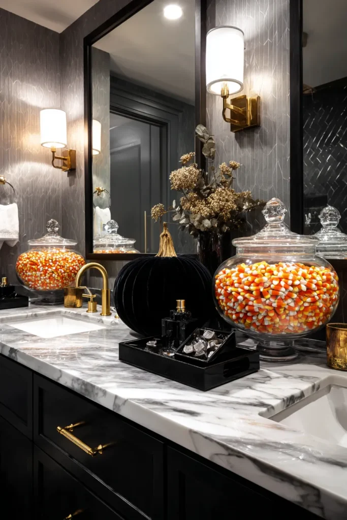 This bathroom takes a fun approach with oversized jars of candy corn stealing the spotlight. A bold black vanity with marble countertops adds sophistication, while gold fixtures and a velvety black pumpkin make it feel glamorous. The pops of orange, yellow, and white from the candy add a playful energy that’s both festive and eye-catching.