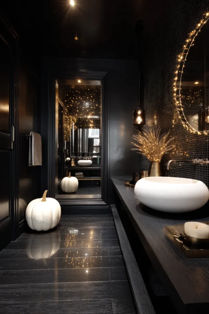 Dark walls and shimmering lights transform this bathroom into a magical Halloween retreat. A round mirror framed by twinkling fairy lights creates a starry effect, while white pumpkins and gold accents keep the look seasonal yet chic. The glossy black finishes reflect the warm glow, making the whole space feel both dramatic and enchanting.
