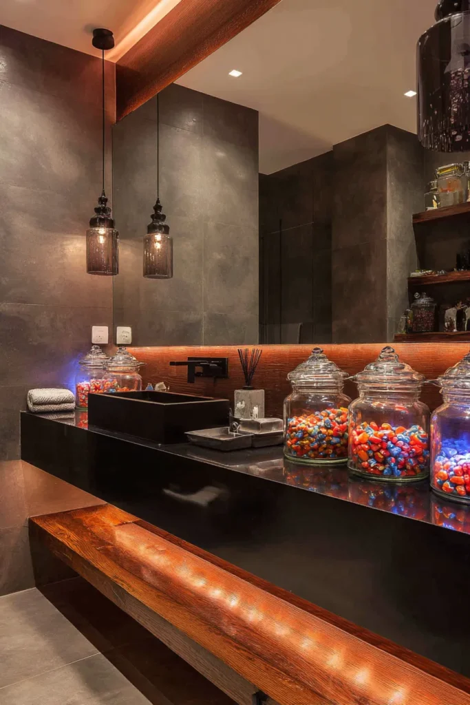 This bathroom uses sleek lines, rich textures, and soft lighting to create a sophisticated Halloween vibe. Glass jars filled with colorful candy add a festive pop, while warm lighting and wood tones soften the dark finishes. The contrast between the refined modern design and playful candy display makes the space feel both stylish and fun.