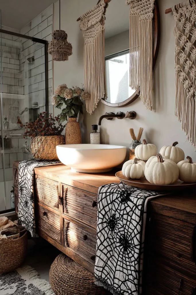 This bathroom embraces a cozy bohemian style with woven baskets, macrame wall hangings, and a rustic wood vanity. White pumpkins add a seasonal touch, while spiderweb-patterned towels bring a playful Halloween detail to the earthy tones. The mix of natural textures and soft lighting creates a space that feels warm, inviting, and stylishly seasonal.