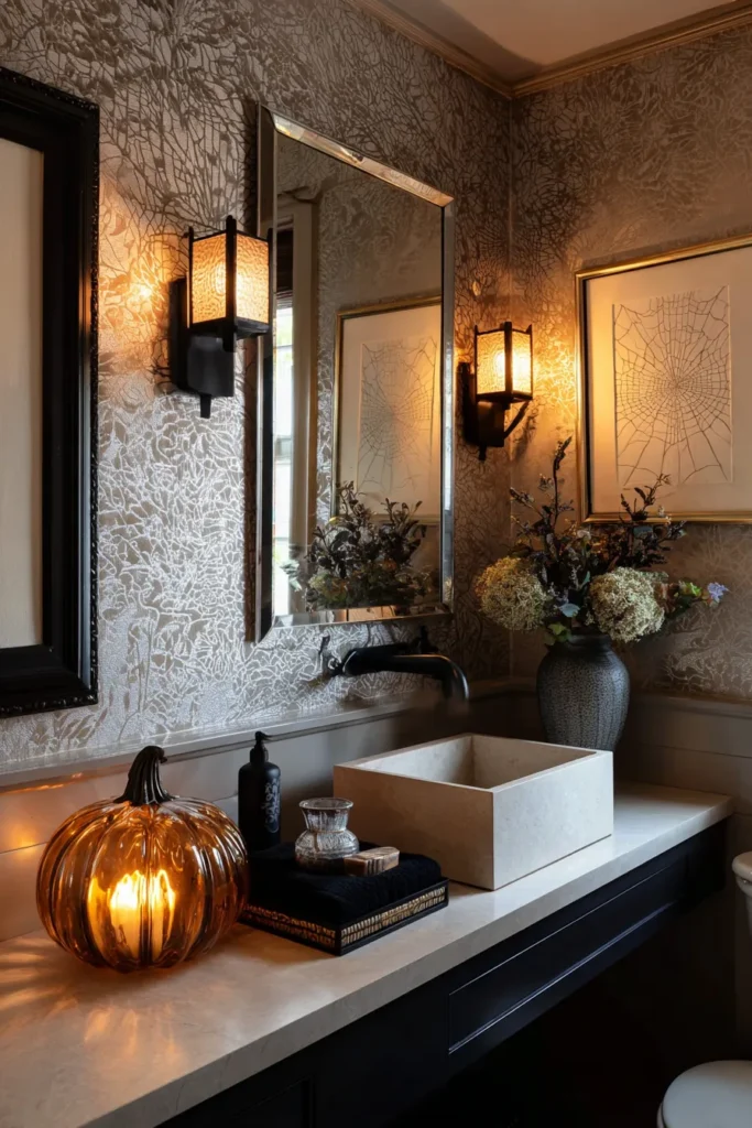 A metallic pumpkin lamp takes the spotlight in this elegant bathroom, paired with soft patterned wallpaper and floral arrangements. The square stone sink and clean lines of the vanity balance the cozy lighting, making the space feel refined yet festive. Spiderweb art on the walls ties the seasonal look together without overpowering the room.