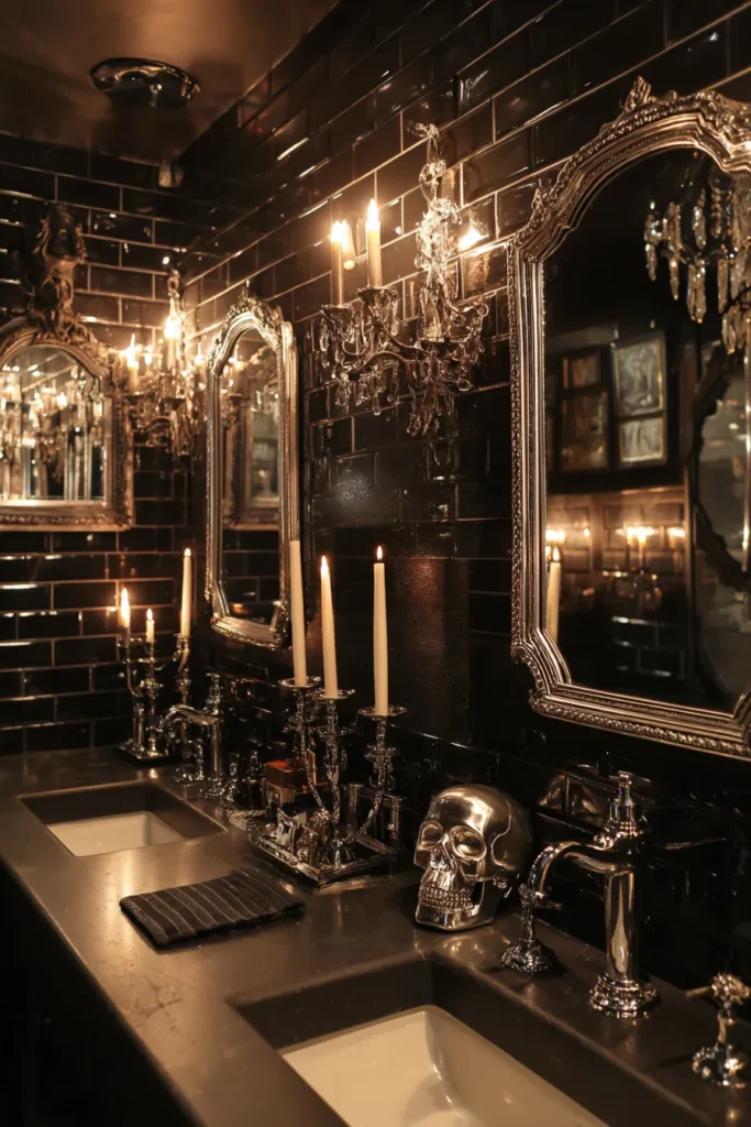 This dark, glossy bathroom leans into Halloween drama with black tiled walls, ornate mirrors, and glittering chandeliers. A polished silver skull adds a bold seasonal touch, while clusters of candelabras give the room a moody, romantic glow. The mix of sparkle and shadow creates a bathroom that feels like a gothic fairytale.
