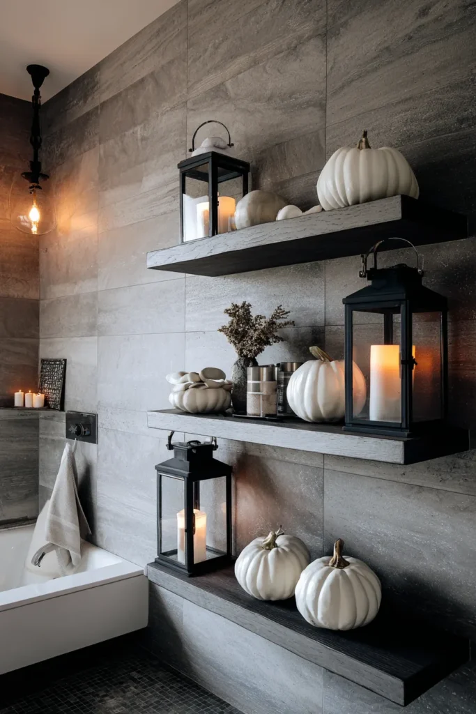 This bathroom pairs cool gray tile with floating shelves styled with lanterns, candles, and white pumpkins. The sleek design keeps things modern, while the warm candlelight softens the look and makes it feel welcoming. The arrangement of seasonal accents is simple but striking, creating a calm and chic autumn atmosphere.