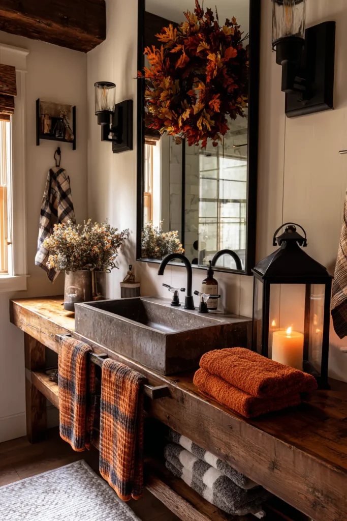 Here, a rustic bathroom with a stone sink and wooden vanity gets dressed up for the season with warm plaid towels, autumn wreaths, and glowing lanterns. Pops of burnt orange bring festive energy while keeping the design grounded and homey. The overall feel is welcoming, cozy, and perfect for fall gatherings.