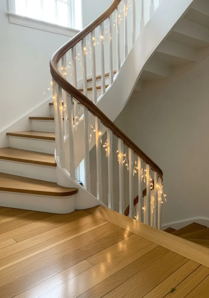 This staircase feels timeless with its soft white walls, warm wood railing, and delicate string lights draped along the banister. The gentle glow follows the elegant curve, creating a soft and inviting path that instantly feels magical yet effortless.