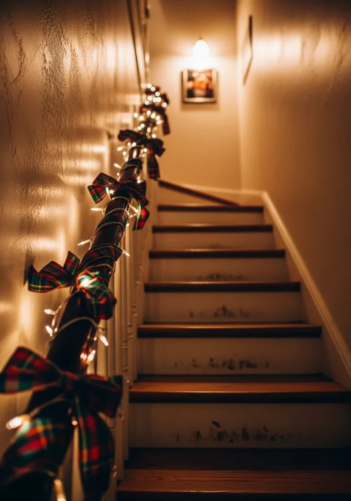This staircase is glowing with holiday warmth thanks to the twinkle lights and cheerful plaid bows tied neatly along the railing. The soft golden light bouncing off the wall gives the space an inviting, cozy feel.