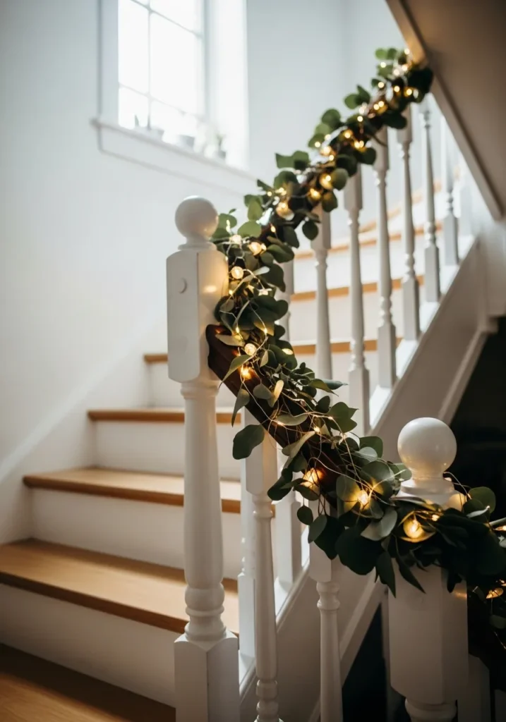 This staircase keeps it light and airy with eucalyptus leaves and delicate fairy lights woven along a white railing. The natural greenery gives it a refreshing look that feels modern yet still festive.