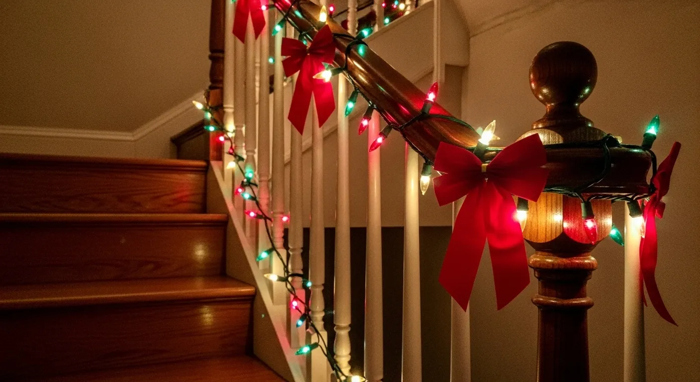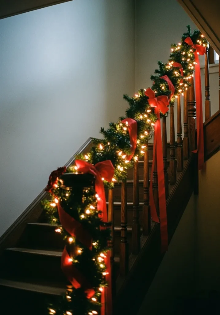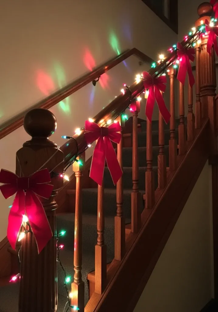 This staircase goes all-in on classic Christmas charm with colorful string lights and big red bows tied along the banister. The light reflections on the wall make the whole area sparkle with festive joy.