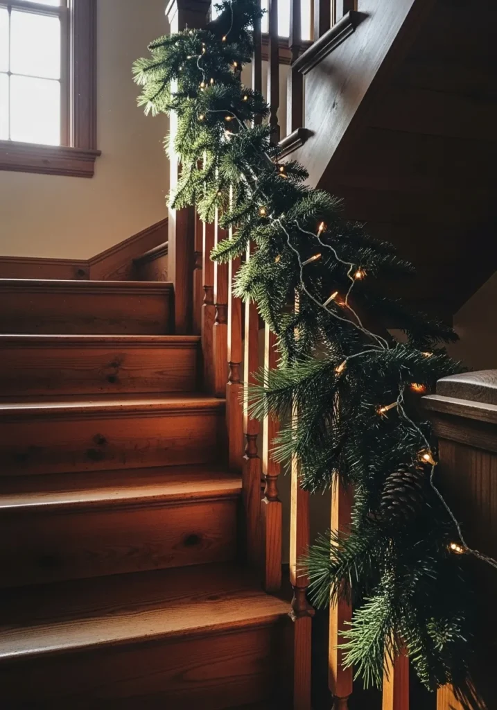 There’s something about Christmas lights on a staircase that instantly makes a home feel like it’s glowing from the inside out.