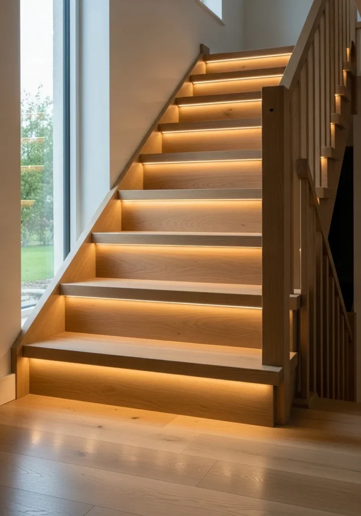 These wooden stairs glow with built-in step lights that feel modern and cozy all at once. The soft golden tone highlights every step and pairs beautifully with the light oak wood, giving the staircase an effortless warmth.