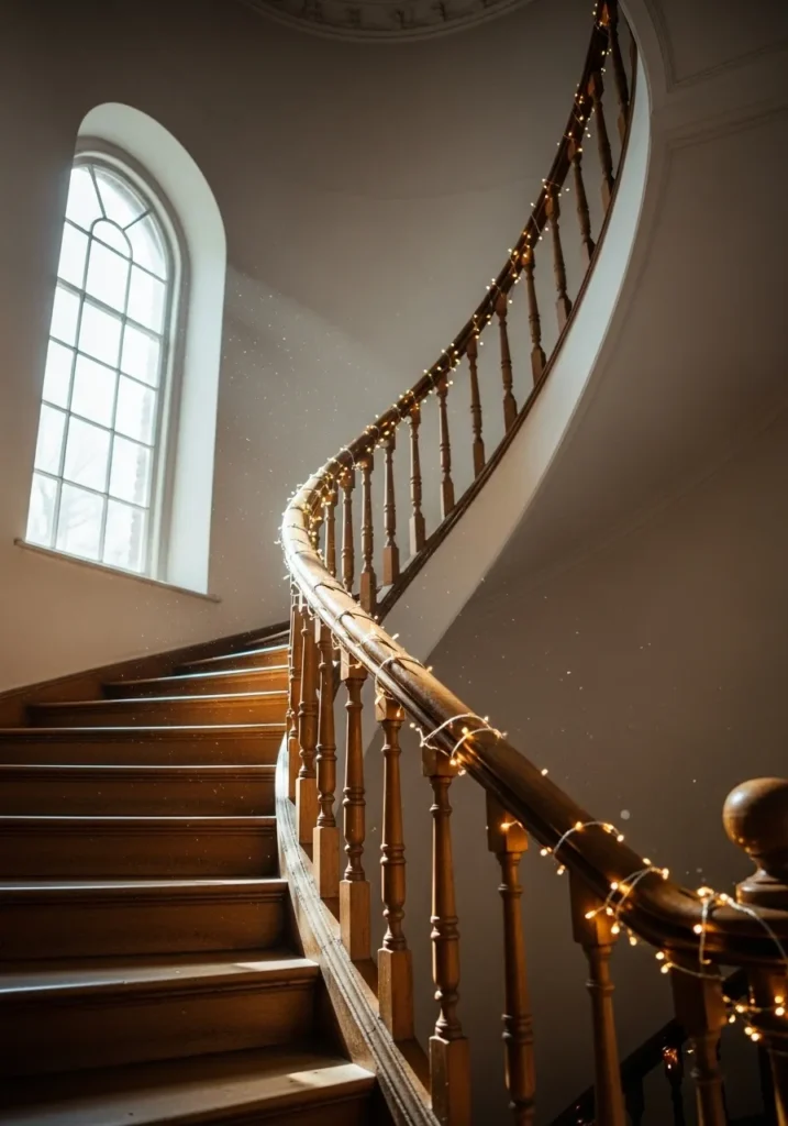 Here, the delicate string of fairy lights wraps softly around a graceful wooden banister, catching the sunlight streaming through the tall window. The light plays beautifully on the polished wood, creating a dreamy, airy feel.