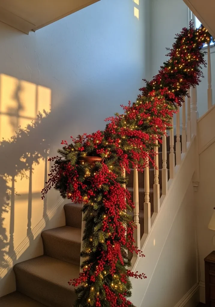 This staircase bursts with Christmas cheer thanks to a thick garland of evergreens and bright red berries, woven through with warm twinkle lights. The sunlight spilling across the wall adds even more magic to this festive scene.