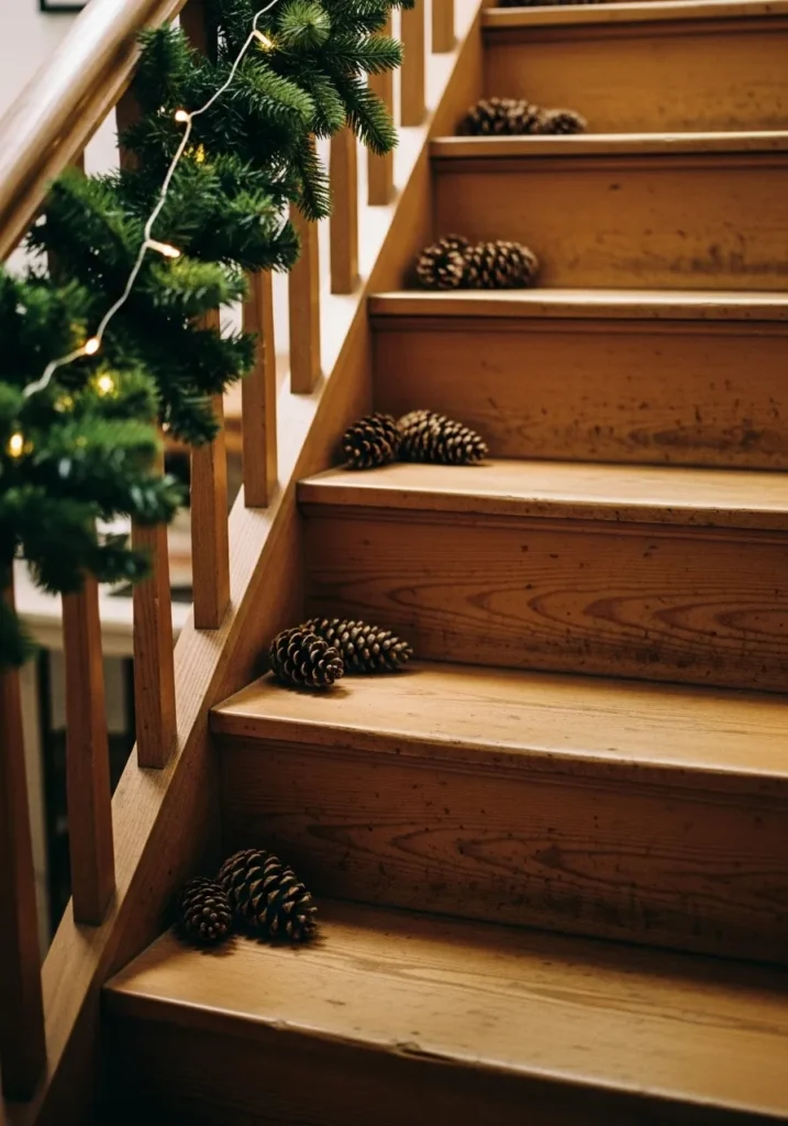 This staircase has that lovely woodland charm with its simple garland of evergreens and softly glowing string lights. The scattered pinecones on each step add such a natural, cozy touch that feels like bringing a little piece of the forest inside.