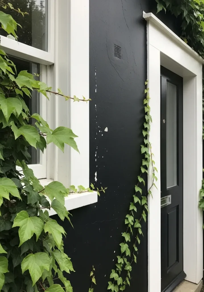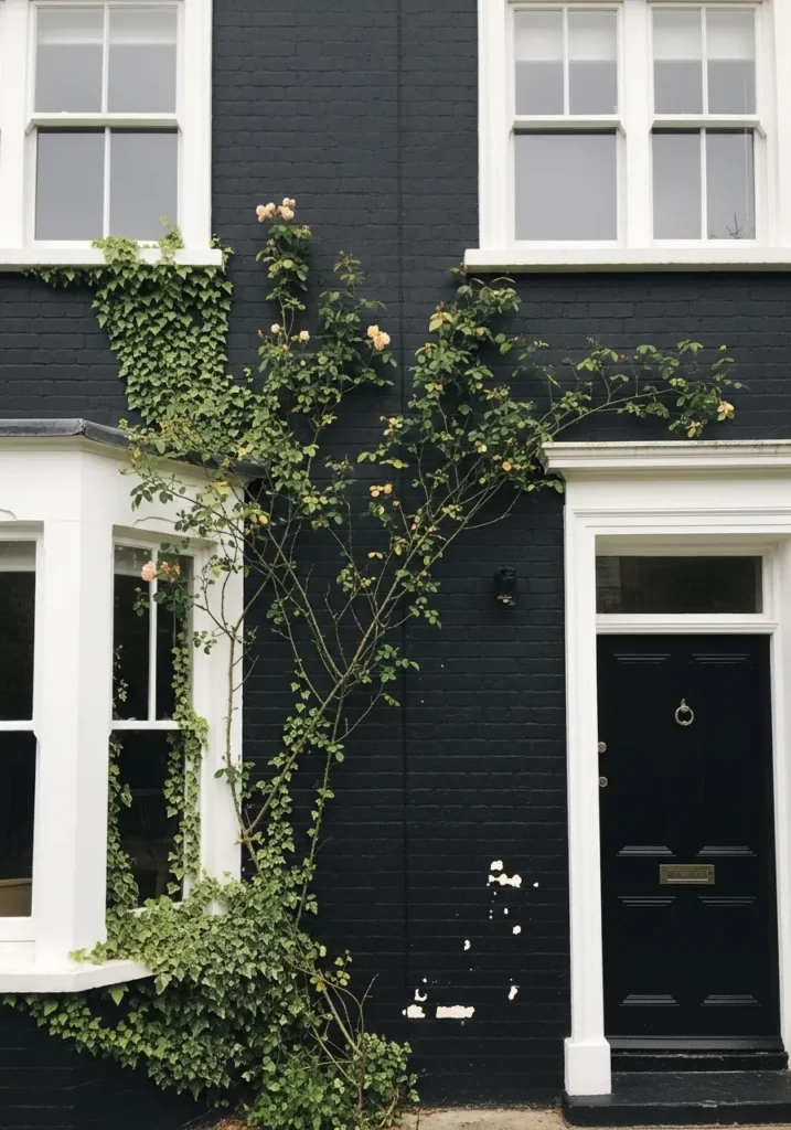 The undertone leans just a touch cool, though it stays fairly neutral overall. In bright light it can soften into a dark charcoal, which actually helps on surfaces that get a lot of use. It pairs easily with greenery and simple white exteriors, and it’s a forgiving choice if you don’t want to repaint every little mark right away.