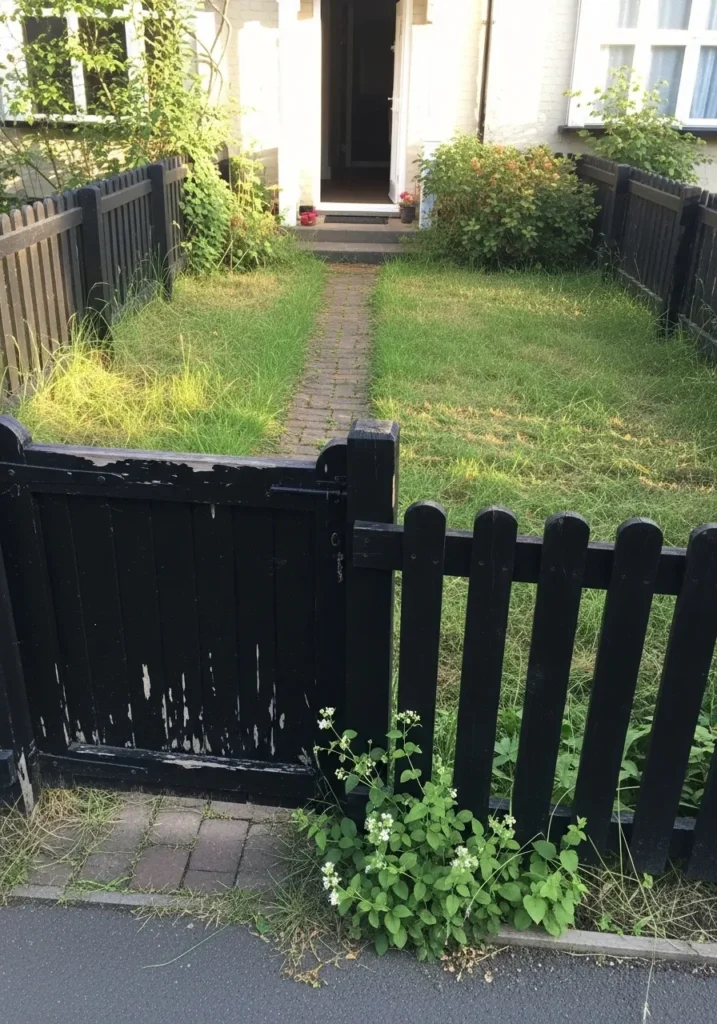 This reads closest to Benjamin Moore Black HC-190, a soft, slightly muted black that works well on exterior wood like fencing. It doesn’t feel too crisp or formal. Even with some peeling and wear showing through, the color still holds up and looks natural in a small front yard setting.