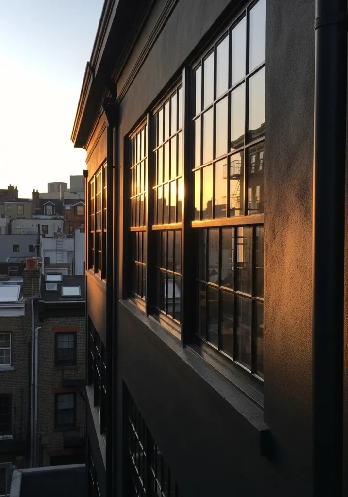 This looks closest to Benjamin Moore Wrought Iron 2124-10, a black that leans into charcoal just enough to feel softer on brick. It doesn’t read as a flat, inky black. There’s a bit of give to it, especially next to the crisp white window trim and that black door, which keeps the contrast from feeling too sharp.