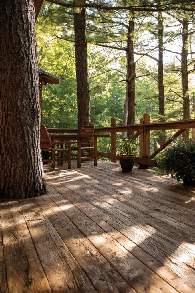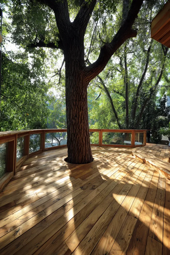 This deck stretches gently around a tree trunk, with natural wood boards and minimal railings that keep the focus on the surrounding forest. Sunlight filters through the trees, casting soft shadows across the floor.