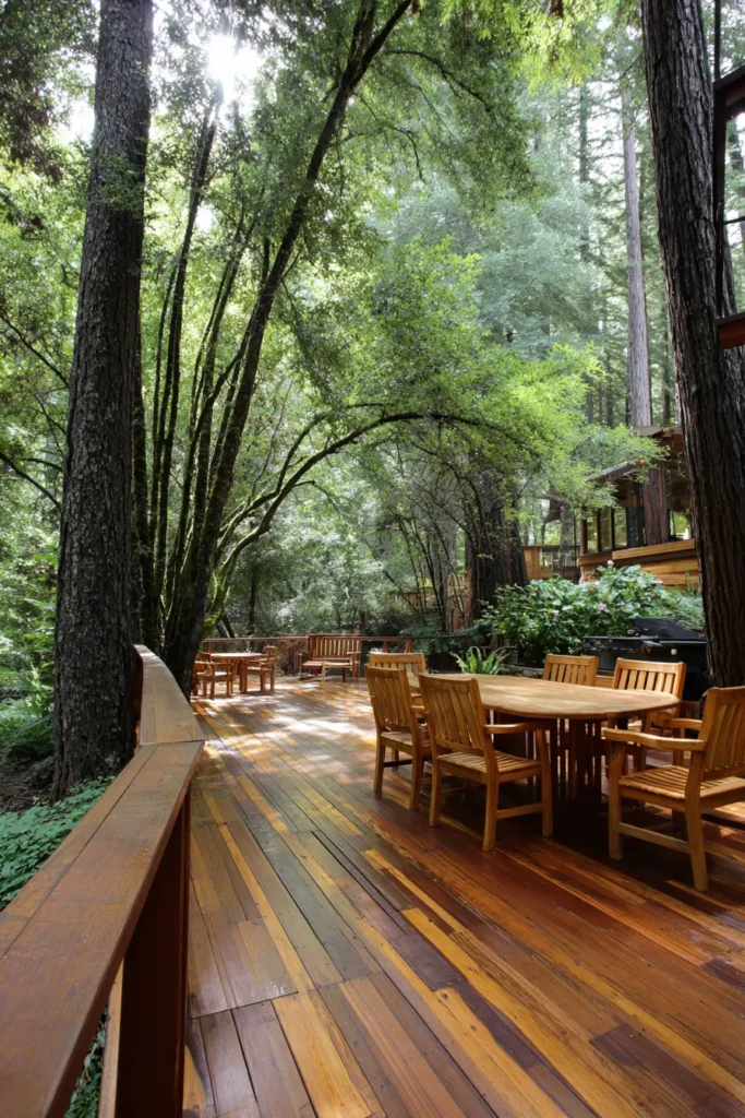 This deck stretches out beneath tall trees, creating a shaded dining area that feels tucked into the forest. The wood table and chairs blend effortlessly with the deck, and the surrounding greenery wraps the space in a soft, peaceful atmosphere. It feels like an outdoor room designed for long meals and laughter.