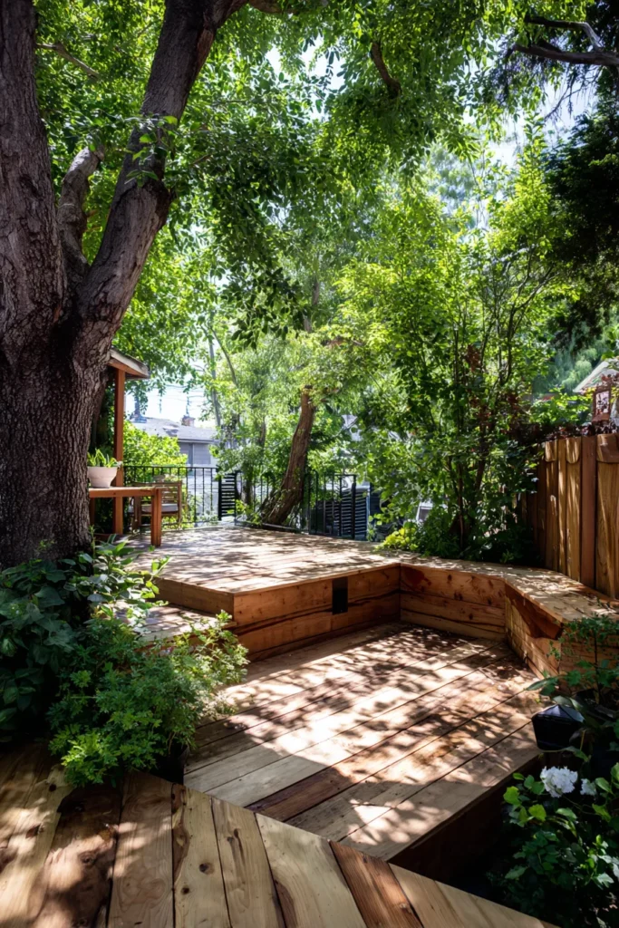 I really appreciate how peaceful this setup feels. It looks like the kind of deck where you could sit quietly and watch the light shift through the leaves. The built in seating makes it feel welcoming without cluttering the design.