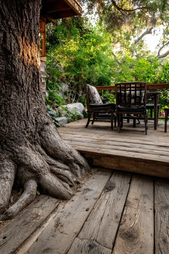 This deck leans into a raw and natural look, allowing the tree roots and trunk to remain fully visible. The wood boards feel weathered and earthy, almost like the deck has grown there over time. Everything feels grounded and quietly beautiful.