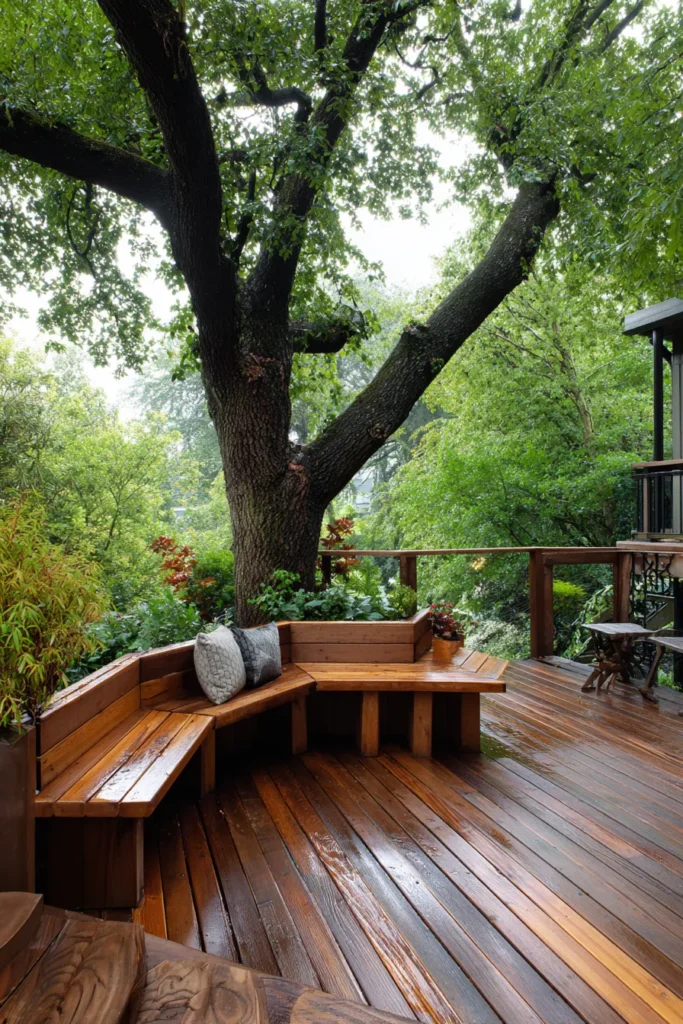 This deck features built in benches that curve around a central tree, turning it into a shaded lounging area. The warm wood and soft cushions make the space feel cozy while still being open to nature.