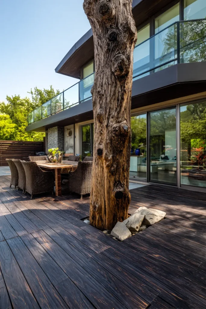 This deck flows seamlessly from the modern exterior of the house, with dark wood boards wrapping cleanly around an existing tree. The tree rises straight through the deck, creating a bold contrast against the sleek lines of the home and the smooth glass walls nearby. Everything feels intentional and well balanced, blending architecture and nature into one cohesive outdoor space.