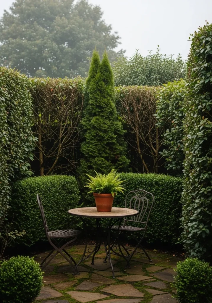 This backyard corner feels like a secret hideaway tucked behind layers of lush hedges and neatly trimmed greenery. A small bistro table sits on a stone path, surrounded by tall shrubs that naturally block out the rest of the world. The mix of soft foliage, structured hedges, and simple garden furniture makes the space feel intimate and calm without trying too hard.