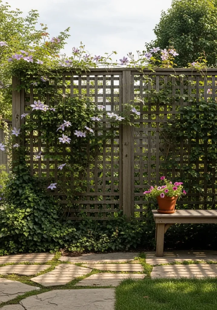 A lattice fence covered in climbing plants creates a charming and breathable privacy solution. The greenery softens the structure and adds color and life to the space. A simple bench and potted plants complete the look without overcrowding it.