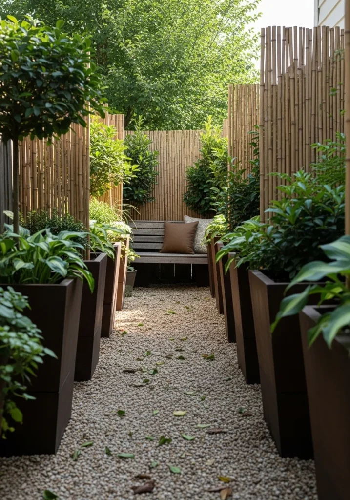 This narrow garden path is framed with tall planters, greenery, and wooden fencing that guide you through the space. The vertical elements help block surrounding views while making the area feel intentional and serene. Every detail works together to create depth and calm.