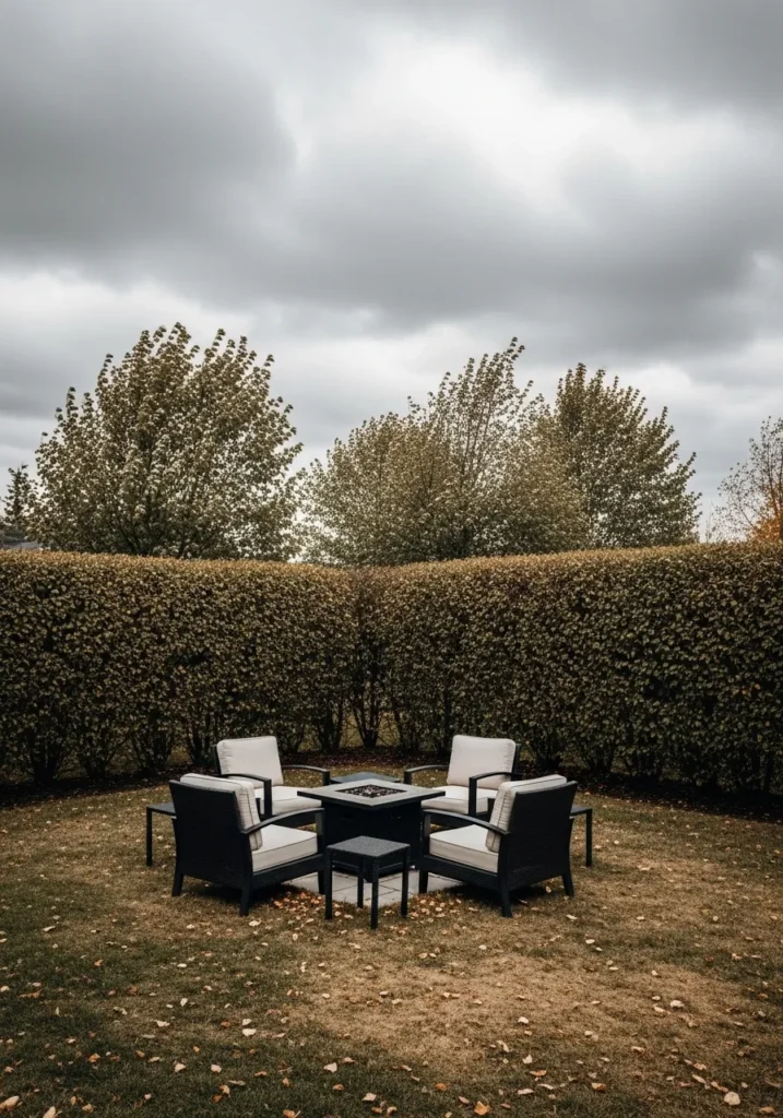 Tall hedges surround this seating area and create a green wall that gently blocks the outside world. The furniture sits comfortably in the center, making the space feel grounded and relaxed. The natural border keeps everything feeling open while still protected.