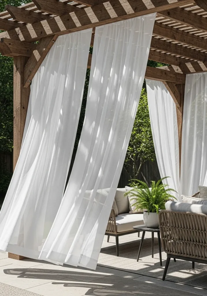 A wooden pergola is softened with sheer white curtains that sway gently with the breeze. The fabric creates instant privacy while keeping the space light and airy. The seating underneath feels shaded and comfortable without losing that open outdoor feeling.