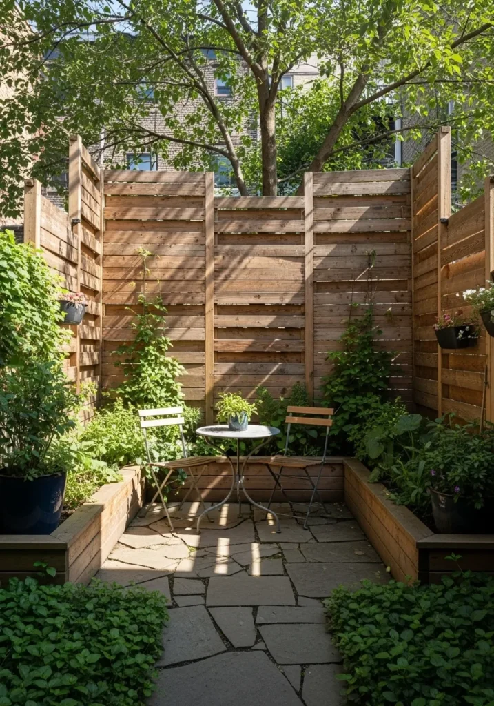 This small outdoor corner uses a tall wooden fence to create instant privacy without feeling boxed in. A compact bistro table and folding chairs sit on a stone patio, with soft sunlight warming the wood tones. The setup feels casual and intimate, perfect for quiet mornings or relaxed evenings outside.