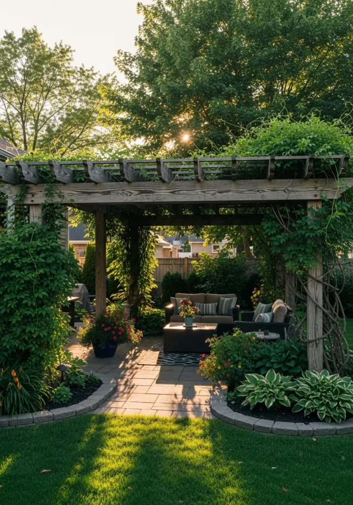 A wooden pergola frames this backyard beautifully while climbing plants and layered landscaping add natural privacy. The seating area feels tucked away beneath greenery and filtered sunlight. The combination of structure and plants makes the space feel grounded and serene.