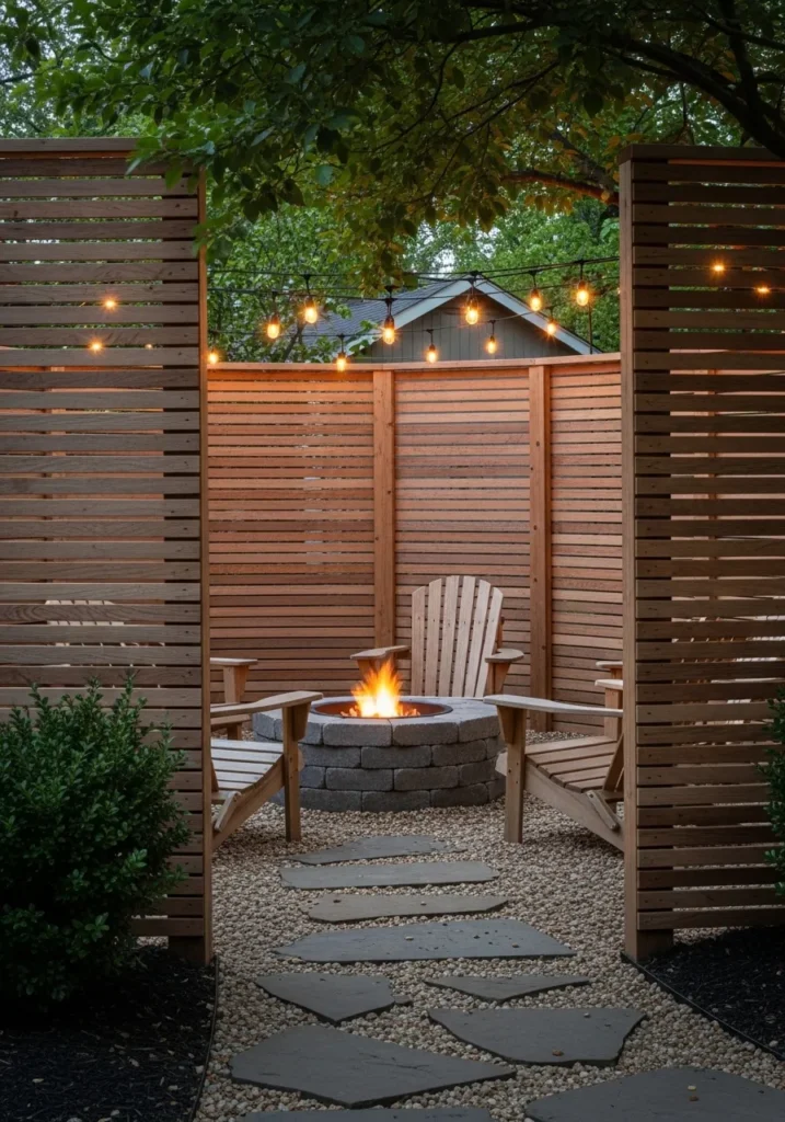 Wooden privacy panels surround a small fire pit area, creating a cozy outdoor room tucked away from view. Soft lighting and warm wood tones make the space feel inviting and protected. The stone path adds structure while still keeping the vibe relaxed.