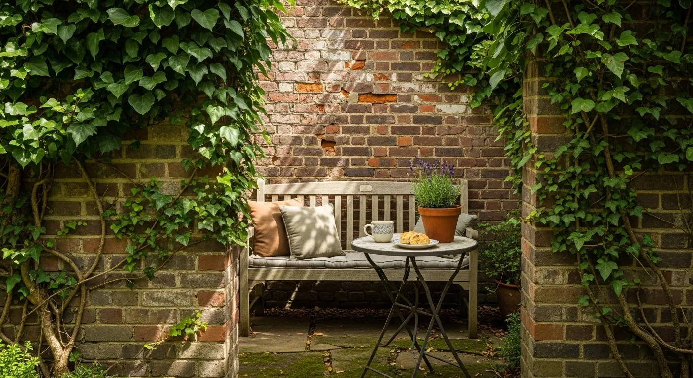 This cozy seating nook is wrapped in climbing greenery that softens an old brick wall. The plants form a natural frame around the seating area and create a sense of enclosure that feels warm and inviting. Stone pavers and potted plants complete the tucked away garden feel.