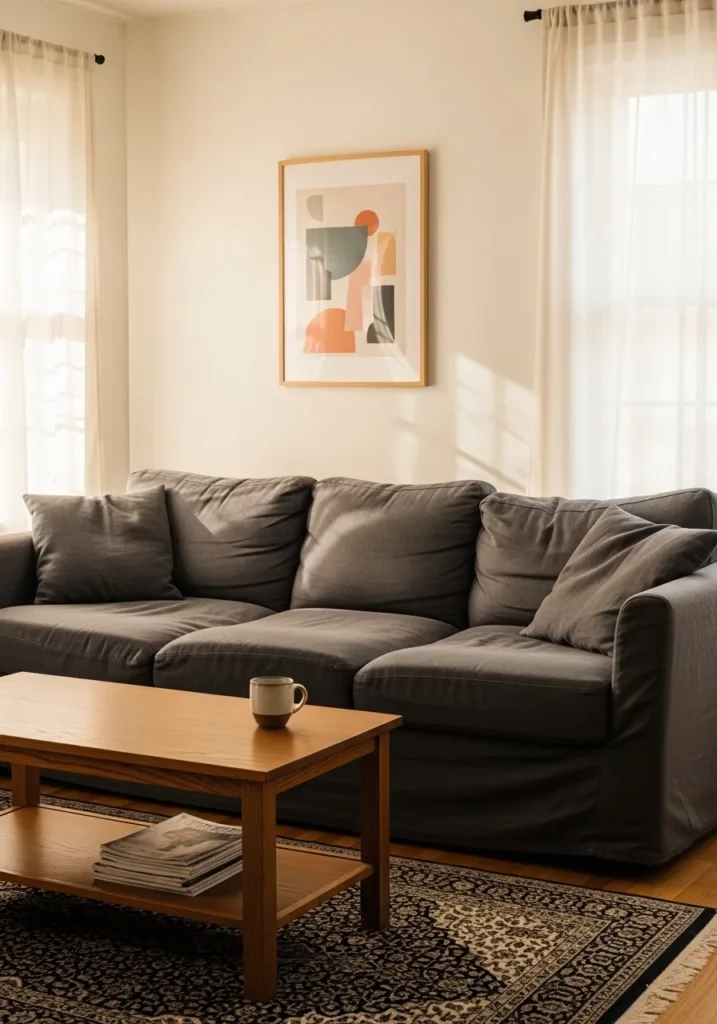 This living room setup is the ultimate example of how soft white can make a space feel incredibly inviting. The walls are bathed in a creamy glow that perfectly complements the natural light streaming through those breezy sheer curtains. A deep charcoal sofa provides a grounded contrast against the light walls, while the wooden coffee table adds a touch of organic texture. The geometric art piece on the wall ties all the earthy tones together and brings a modern splash of color to this serene corner.