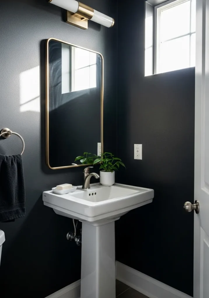 This powder room design proves that going dark in a small space can yield incredibly high-fashion results. The walls are coated in a saturated, true black that creates a sleek and seamless backdrop for the elegant white pedestal sink. Gold accents take center stage here, with a slim-profile rectangular mirror and a modern vanity light adding a luxurious, jewelry-like sparkle to the room. The inclusion of a small green plant provides a necessary pop of organic life, ensuring the high-contrast aesthetic feels fresh rather than heavy.