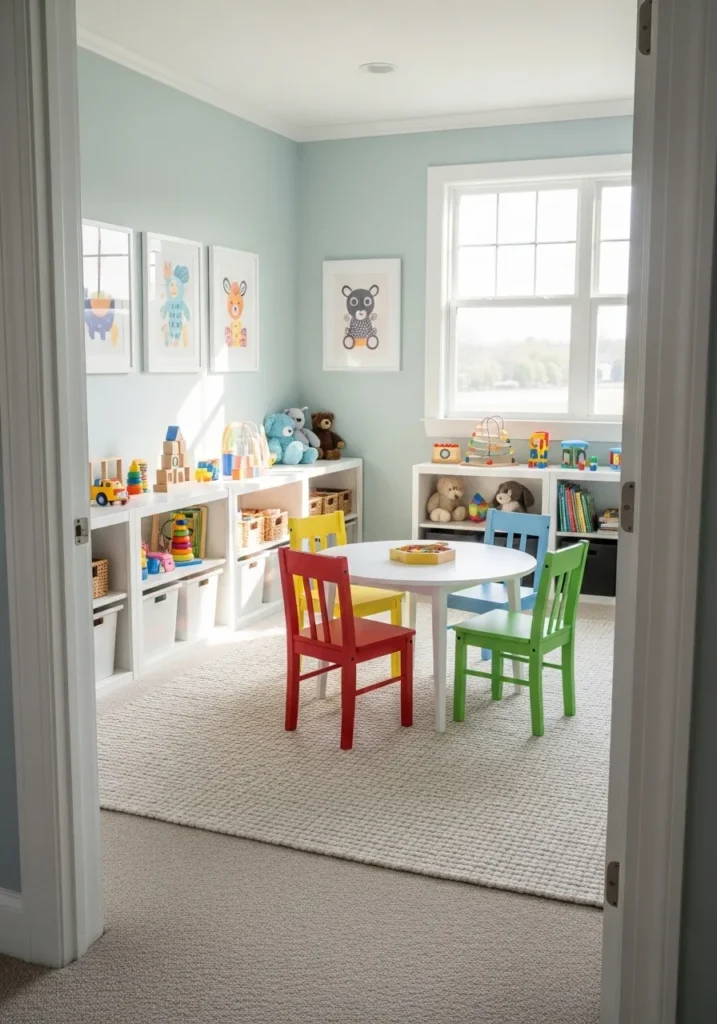 This bright and cheery playroom is a dream come true for any little explorer. The walls are coated in a refreshing minty aqua that provides a calm foundation for all the vibrant pops of primary color throughout the space. White storage cubbies keep toys and books neatly organized, while the low circular table with its rainbow array of chairs invites endless hours of crafting and imagination. Natural light floods in from the large window, making the soft wall color feel incredibly airy and light, which perfectly balances the busy energy of a dedicated play zone.