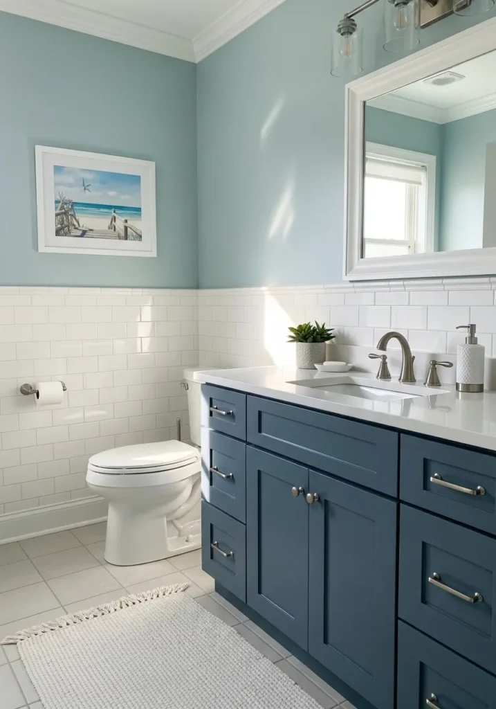 This bathroom design is a masterclass in layering cool tones to create a space that feels like a perpetual vacation. The upper portion of the walls is painted in a breezy, light cerulean that perfectly mimics a clear afternoon sky. Below, classic white subway tile adds a crisp, clean texture that balances the deeper slate blue of the vanity. Brushed nickel hardware and a simple beach-themed art piece pull the nautical aesthetic together, while the natural light reflecting off the white surfaces keeps the entire room feeling open and airy.