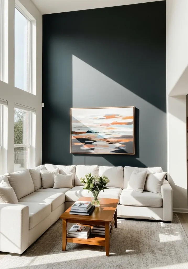 This living area is a total masterclass in how to use high ceilings and dramatic color to your advantage. The massive accent wall is drenched in a deep, velvety charcoal that creates a stunning backdrop for the large, abstract landscape painting. Below, a plush cream sectional sofa offers a soft place to land and provides a crisp contrast against the dark paint. A warm wood coffee table and a neutral area rug ground the space, while those floor-to-ceiling windows let in enough natural light to keep the dark feature wall feeling expensive rather than heavy.